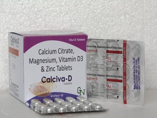 Calcium Citrate, Vitamin D3, Zinc Sulphate & Magnesium Tablets come under the brand name “CALCIVA-D TAB”, which are used to treat a range of nutritional deficiencies such as various vitamins and minerals. These are given when the individual isn’t getting enough nutrients from their daily diet or is suffering from some kind of illness.